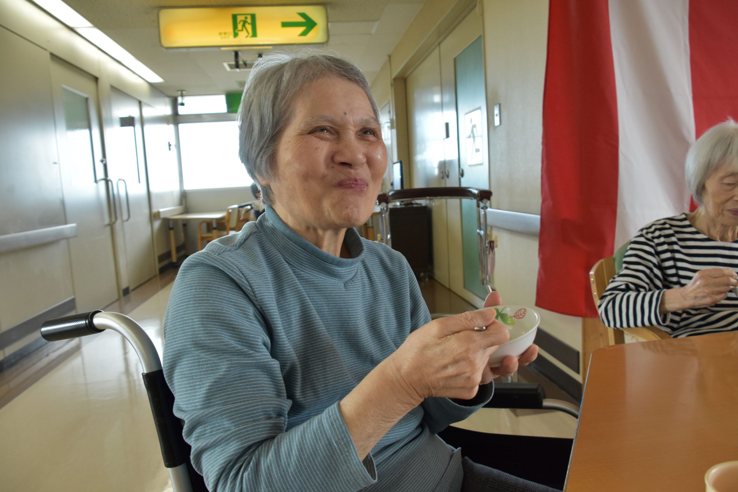 本日のおやつは、桜のおはぎとよもぎのおはぎを召し上がって頂き、