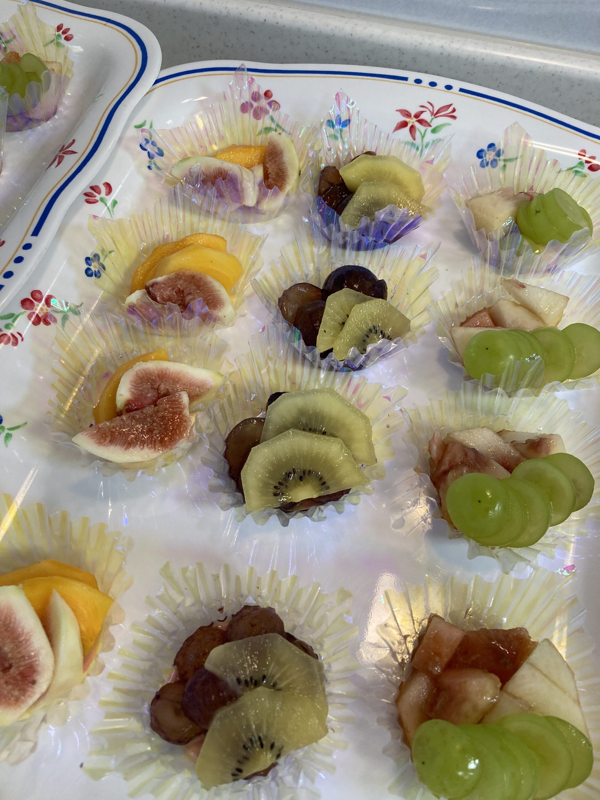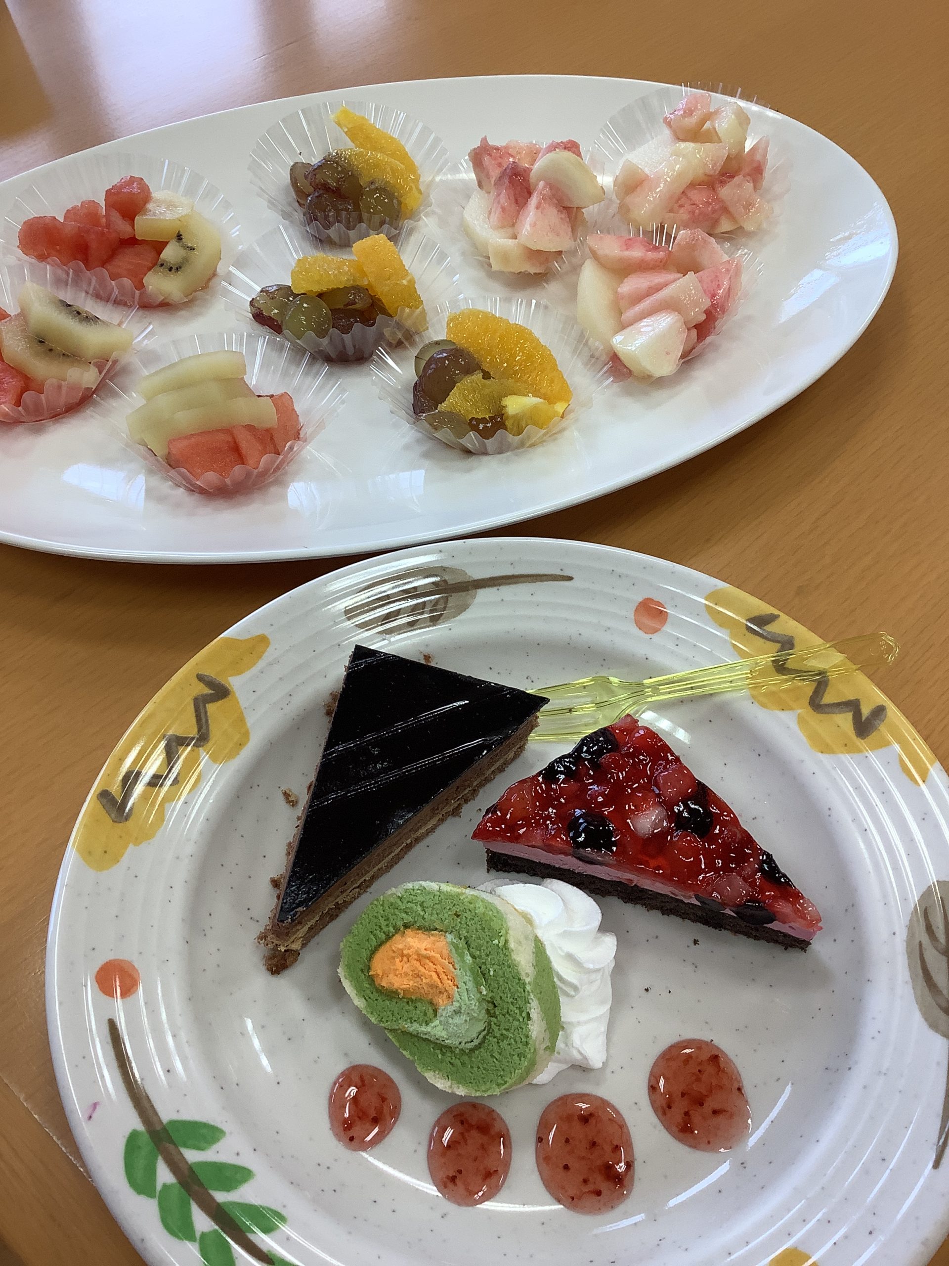 色とりどりのケーキとフルーツを栄養士さんが大皿へ盛り付け下さり🍑🍈🍇🍰