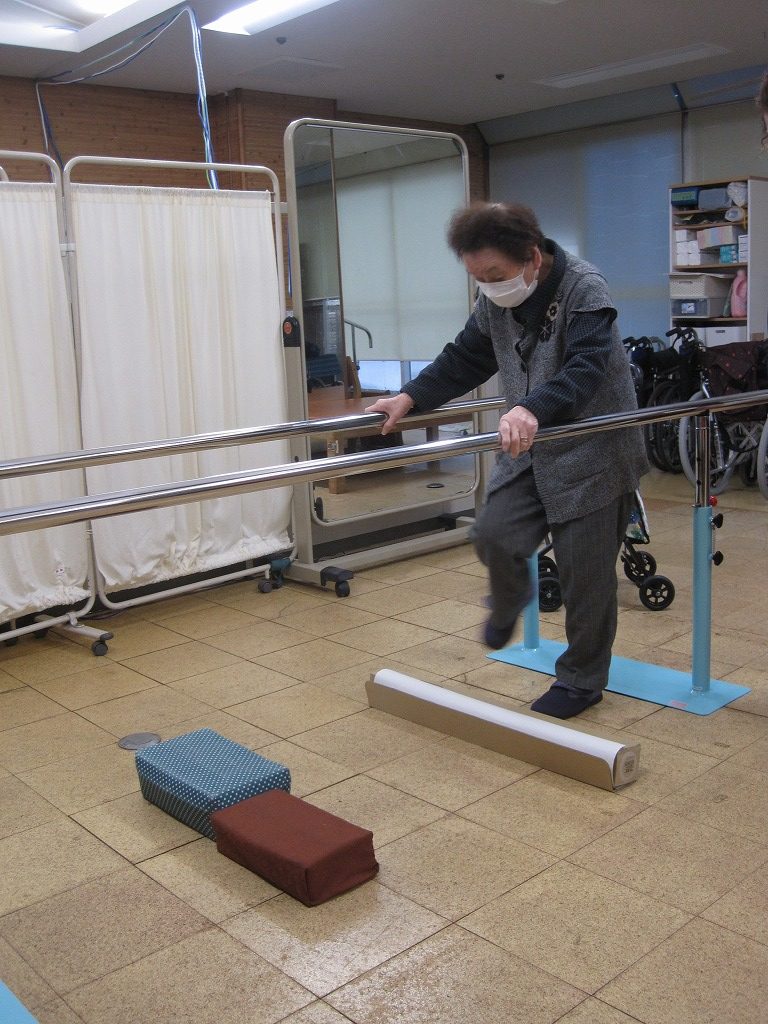 階段に昇って降りた先には・・・平行棒で障害物を乗り越えていきましょう!